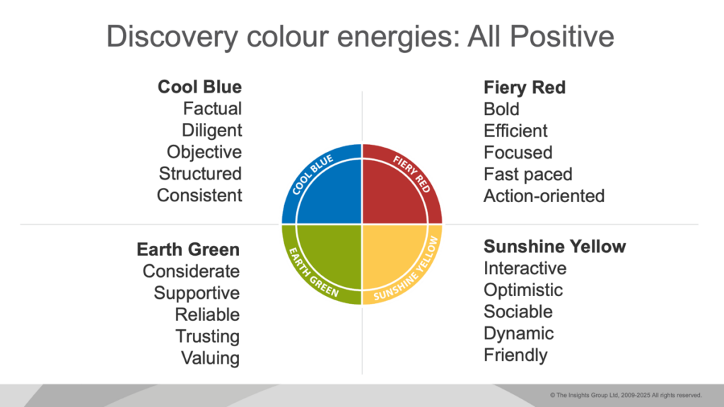 The colour energies make up a person’s unique personality and determine how and why they do the things they do. Based on decades of research, the Insights Discovery personal profile is over 90% accurate.